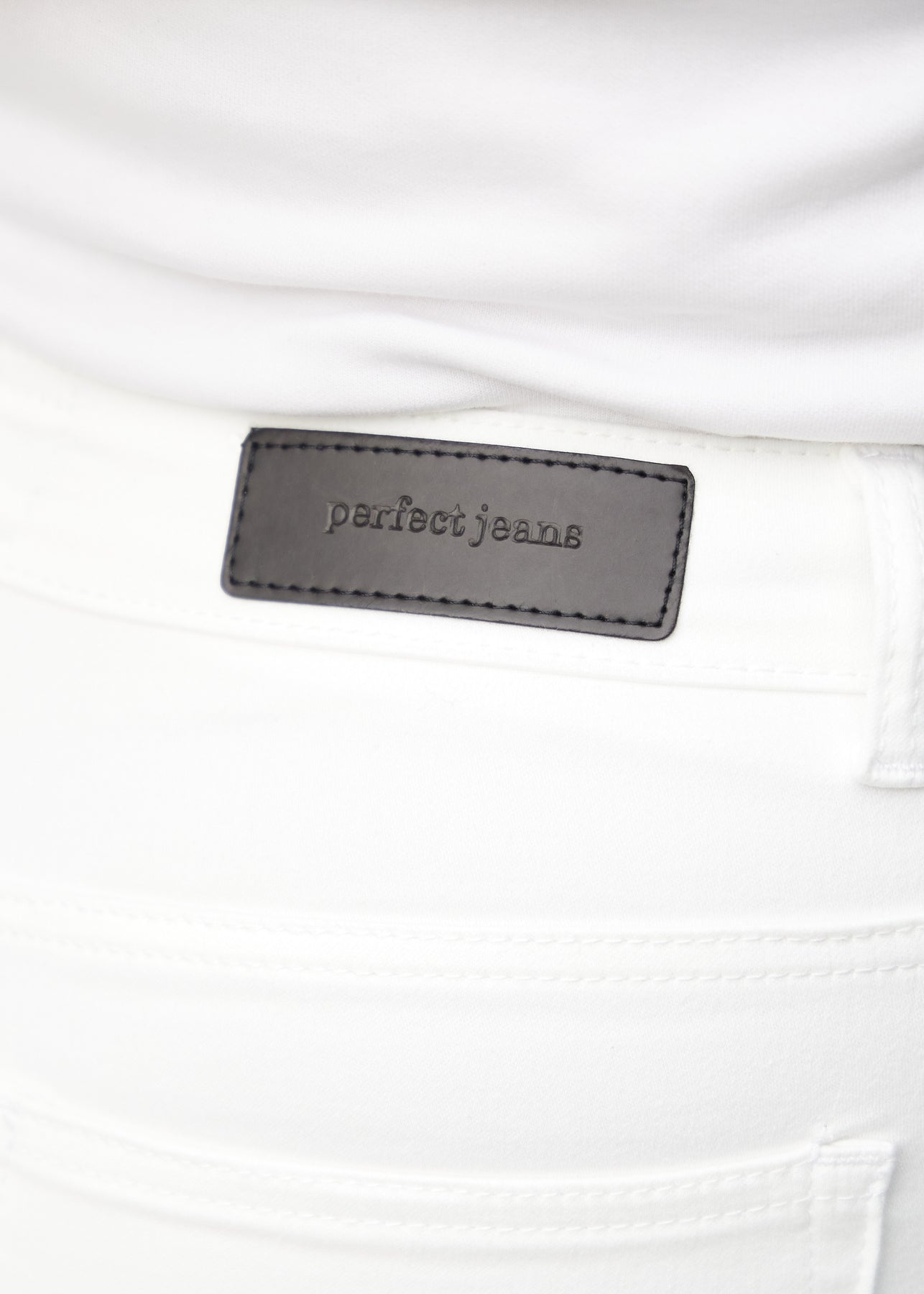 Nærbillede af hvidt jeansmateriale med Perfect Jeans logoetiket ved forlommekanten.