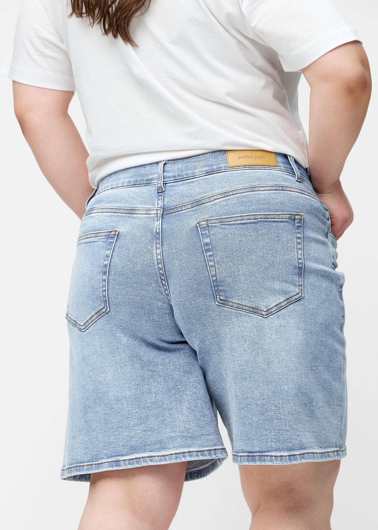 Close-up of light blue denim with Perfect Jeans leather patch at the back waistband, on a plus-size model.