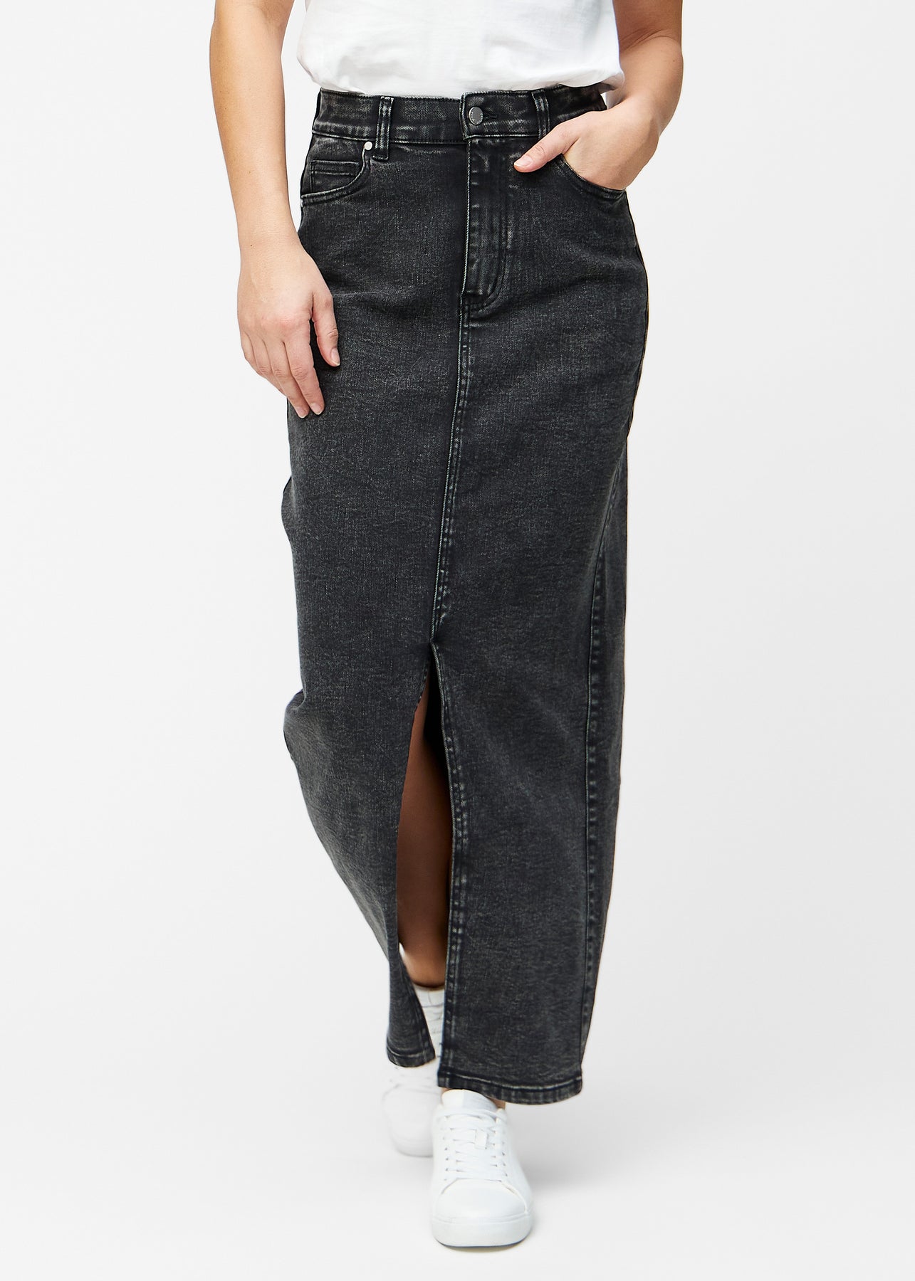 Fuldt billede af plus-size model i lang, mørkegrå denimnederdel i farven Shadows med regulær pasform og slids foran.
