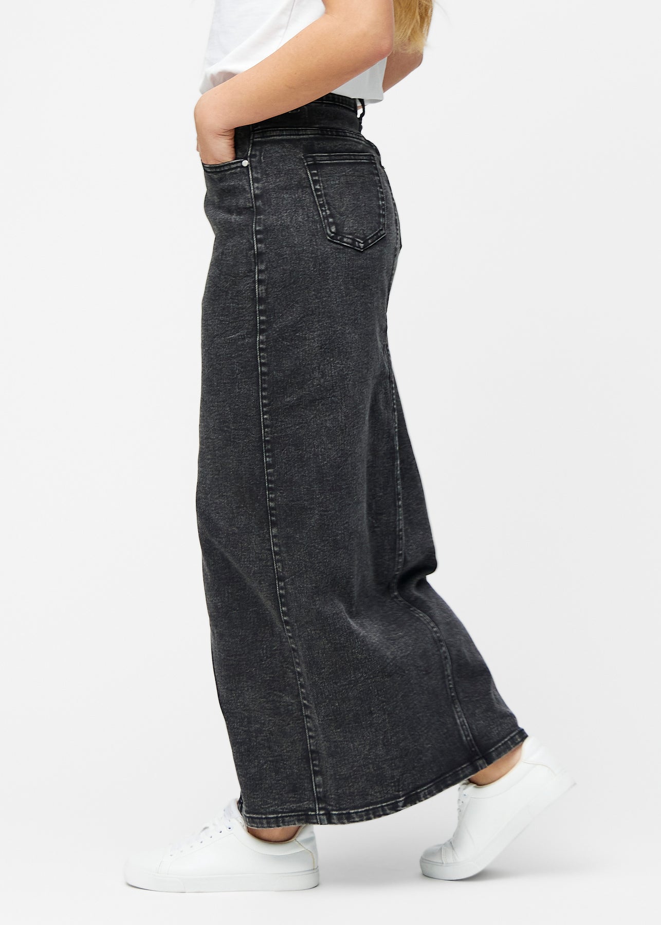 Lang, mørkegrå denimnederdel i farven Shadows med regulær pasform set fra siden på model, med synligt slids foran.