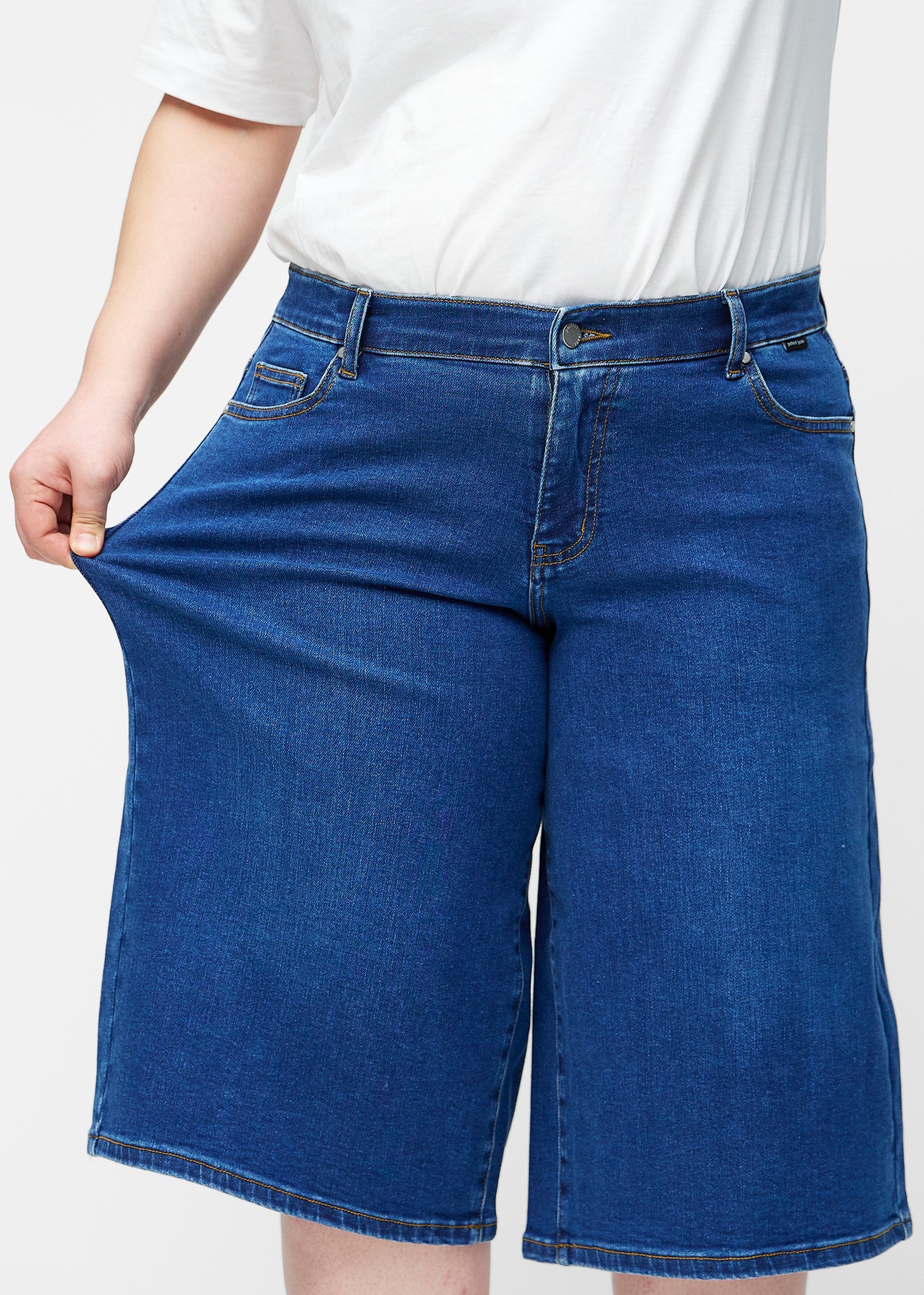 Løse, mørkeblå denim capris i farven Oceans set fra siden på plus-size model, hvor den brede pasform og længden til lige under knæet er synlig.